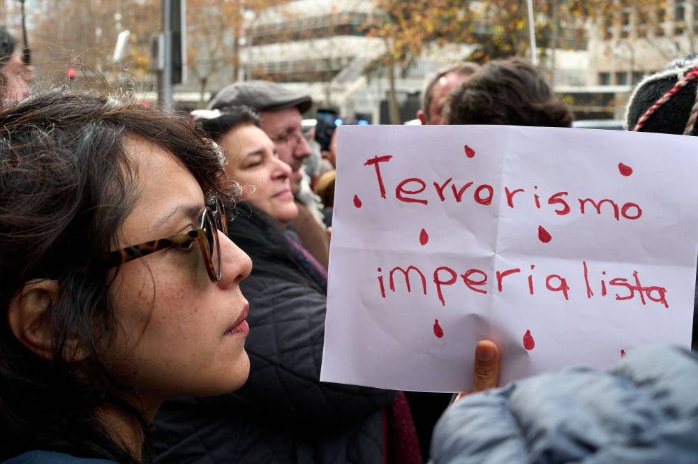 1月4日,一名女子在西班牙马德里市中心的美国驻西班牙大使馆前参加抗议活动,谴责美军突袭委内瑞拉。新华社记者 孟鼎博 摄
